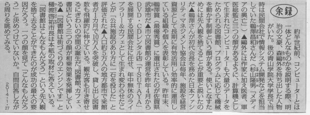 米国ベル研究所で業績を挙げた黒川兼行君へのインタビュー提案 id=1118 Jon Gertner著The Idea Factory – Bell Labs and the Great Age of American Innovationの和訳本「世界の技術を支配するベル研究所の興亡」を読み、知的生産性を考えるヒントがこの中に色々あると感じた。 10月14日(月・体育の日)、東大助教授のポストを振ってベル研に移り14年間の在籍中多くの優れた業績を挙げた黒川兼行君に、「高い知的生産性を誇ったベル研の環境」といった原稿かインタビューを頼めないか電話。 彼は、昨年不整脈で入院し今も薬を飲んでいて原稿は無理だがインタビューならOK、とのこと。彼が今まで書いたものは、GoogleのRONDAN INDEXで見られると言われ、東大生研・生産研究14巻4号やRFワールドのインタビューなどをチェック。 10月15日(火)15時から水天宮の日本オフィス学会で開催の、学会誌委員会で次号にこのインタビューを提案、賛同を得た。 2013/10/15 23:07:12