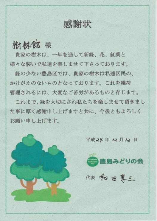 豊島みどりの会より樹林館に感謝状来る id=975 10月初旬、豊島区みどりの会のメンバー20人程が豊島区公園緑地課の職員と樹林館に見え、楠やイチョウの実測と撮影をした。  12月12日(水)、私の留守中にそのメンバーの方々が来られ、樹林館宛の感謝状を置いていかれた。 2012/12/13 01:47:14